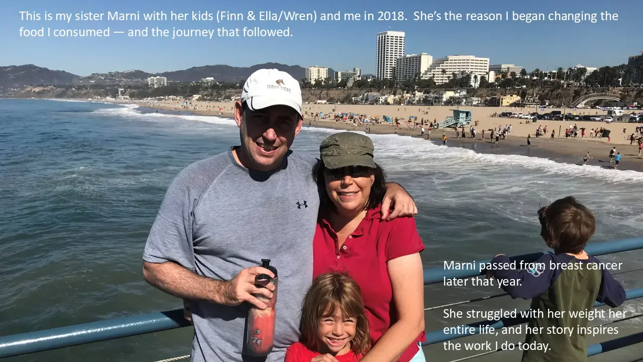 Everything changed in 2018, when my sister Marni was losing her battle with breast cancer. I began researching how food and lifestyle affect our health — and it completely changed my perspective. Unfortunately, Marni passed away later that year at just 49, leaving behind her husband and two beautiful children. Her memory stays with me and motivates me to help others transform their health. I miss my sister so much.
